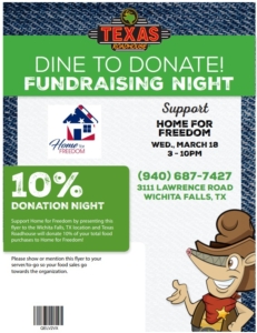Support Home for Freedom by showing/mentioning this flyer to your server/to go order taker at the Wichita Falls, TX location and Texas Roadhouse will donate 10% of your total food purchases to Home for Freedom!